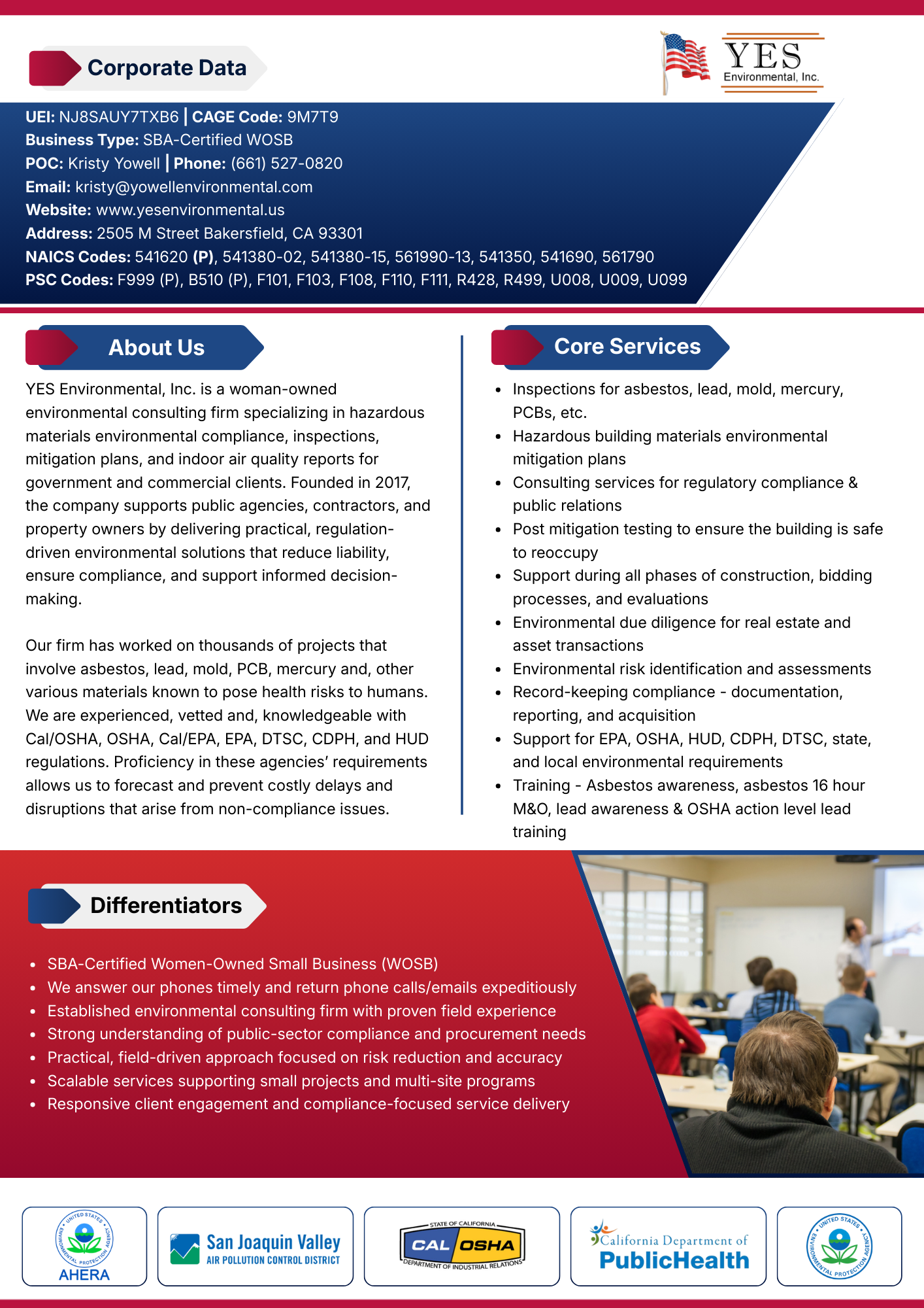 YES Environmental, Inc. is a woman-owned environmental consulting firm with over 20 years of industry experience supporting regulated facilities and public sector clients. Founded in Kern County, the firm provides hazardous materials inspection, compliance consulting, testing coordination, and environmental documentation services aligned with federal, state, and municipal requirements.